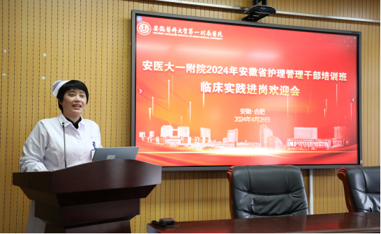 胡少华在致辞中对学员们的到来表示热烈欢迎,并简要介绍了我院医疗护理发展概况、综合实力,详细讲解了本次临床实践教学从前期调研、师资遴选,到计划制定、保障实施等的整体设计,她希望学员们按照安徽省护理学会及岗位实践的要求圆满完成实践任务,达到实践目的,提升管理水平,希望通过带教,互通有无、教学相长。护理部副主任张秀梅就本次临床岗位实践带教计划进行了详细的讲解。