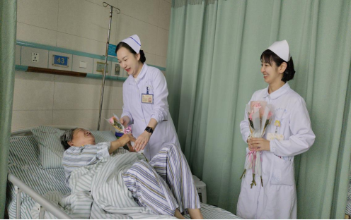 卧床不能参加活动的女性患者,刘玲带着科室护士到病房内送上鲜花和祝福。
