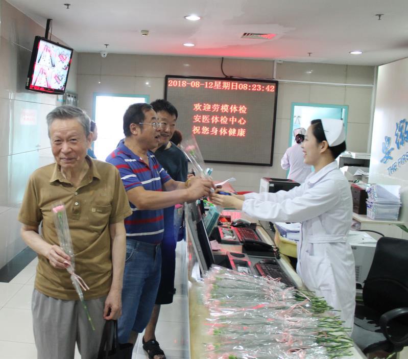 这群特殊的体检者是从1954年到2017年间评选出来的国家级、省级、市级劳动模范,由合肥市总工会统一安排进行健康体检。体检中心对此高度重视,在科主任胡华青主持下召开了检前工作部署会议,强调劳模是党和国家的宝贵财富,他们曾用自己高度的热忱和全部精力为社会的繁荣昌盛做出突出的贡献,体检中心应全力以赴做好接待劳模体检工作。考虑到许多前来体检的劳模已是耄耋高龄,体检中心专门成立了急救医疗小组,以便及时、安全、有效的应对突发和意外情况。体检当天,每位员工都秉持着“热情服务、微笑引导”的原则,并尽最大可能地给行动不便的体检者提供帮助,希望用精湛的医疗技术和温馨细致的服务让劳模切实的感受到关爱和尊重。体检结束后,体检中心为每一位劳模都准备了一朵代表着真挚祝福和由衷敬意的康乃馨,接过工作人员手中饱含情意的康乃馨,劳模们脸上写满了幸福的表情。