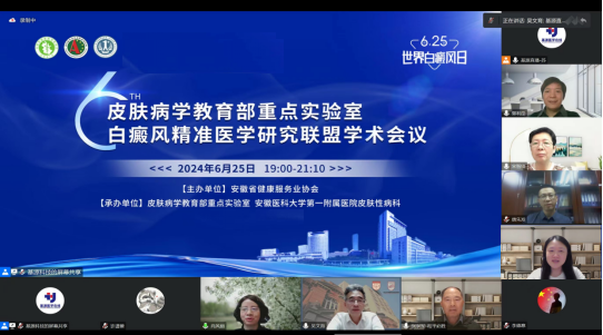 晚上19点,线上学术会议开始,由我院肖风丽教授主持,会议主要聚焦白癜风诊疗热点问题和科研前沿新方向。复旦大学附属华山医院吴文育教授分享了组织工程皮肤移植治疗难治性白癜风的华山经验,为难治性的白癜风提供了新的治疗思路;中华医学杂志英文版风湿病与自身免疫(英文)编辑部郭利劭副编审,从期刊编辑视角详细介绍了论文发表的各个流程,针对性地指导了英文科研论文从构思到发表各个环节的要点和注意事项,助力高水平论文的发表;我院唐先发副教授对白癜风靶向药物的治疗进展进行总结,极大地丰富了白癜风治疗手段;天津医科大学总医院王惠平教授、大连医科大学第一附属医院宋智琦教授分享了自己的实际工作经验,并展开了热烈讨论。肖风丽对授课中的热点问题与讲者进行了充分的讨论,并对会议进行了总结。来自联盟及全国的皮肤科同道共计2000余人次参加了此次会议。
