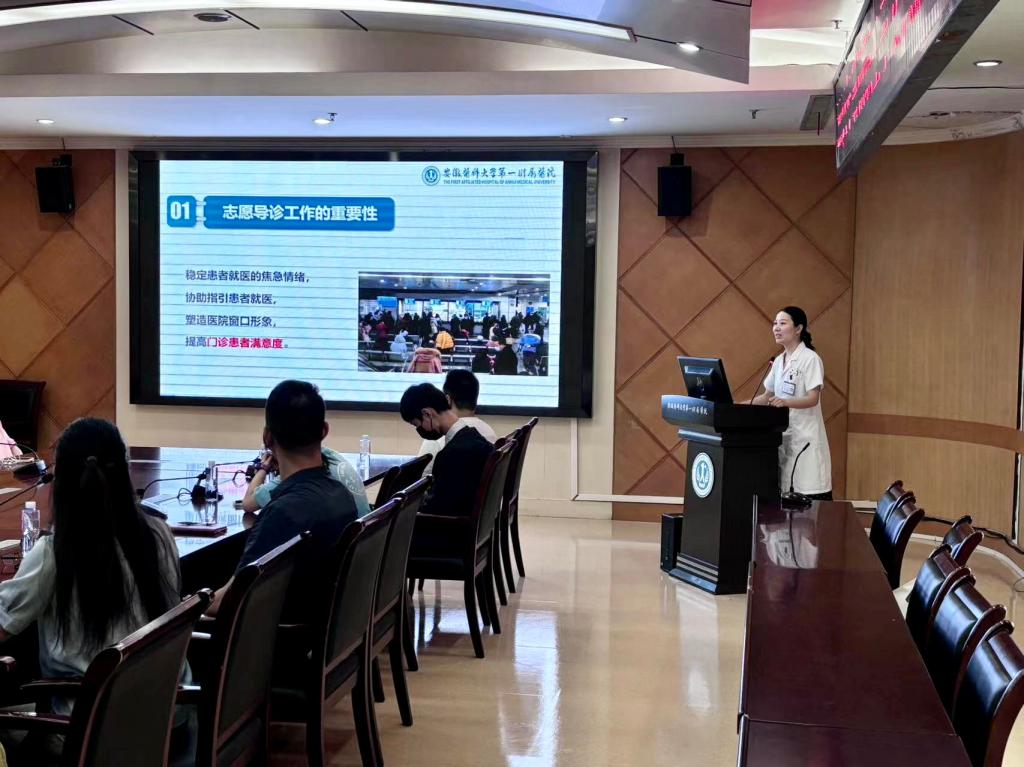 门诊党支部书记、绩溪路门诊部副主任吴丹为志愿者们作门诊导诊培训,高新院区团委书记、高新医务部副部长梁佳宁对志愿者导诊工作的线上签退、排班时间、岗位要求等进行了具体指导。张欣萌、沈梦玥两位同学分别作为职工子女志愿者代表分享了自身通过志愿服务学思践悟、提升见闻学识的宝贵经验。