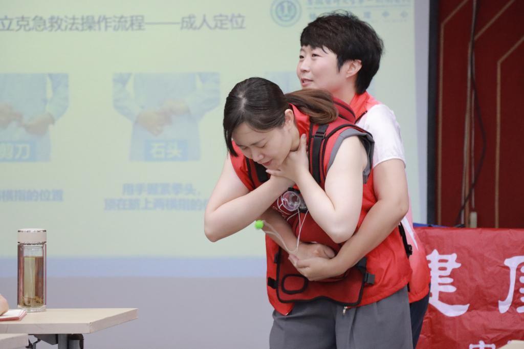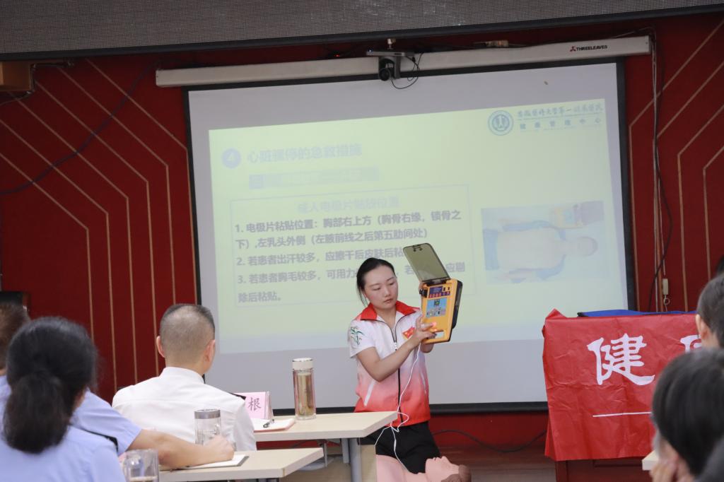 活动现场精彩纷呈,在场的所有人员共同打造了一场互动积极、生动实用的急救知识盛宴。主讲人张晓雨通过PPT课件,详细讲解了中暑、晕厥等常见急症的预防与应对措施,结合真实案例,用通俗易懂的语言,深入浅出地阐述了各种急症的症状、危害以及正确的处理方法,让原本枯燥乏味的急救知识变得生动有趣、易于掌握。讲解中着重强调了海姆立克急救法、心肺复苏术及AED使用等关键急救技能的重要性,并逐一分解介绍了这些技能的操作步骤和注意事项。同时特别提醒了预防大于治疗的原则,引导大家在日常生活中注重自我保护,远离危险。活动还设置了现场知识问答环节,问题涉及急救知识的各个方面。参与者们积极举手回答问题,现场气氛十分活跃。