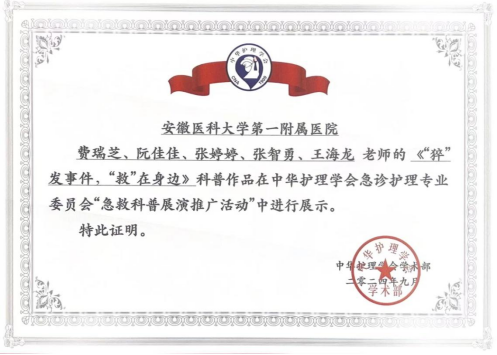 本次大会首次举办“急救科普展演推广活动”,分设“急救知识”“急救技能”“健康素养及灾害防范知识类”三个模块。由急诊内科护士长费瑞芝指导,急诊科护士阮佳佳、张婷婷、王海龙、张智勇团队创作的科普作品《“猝”发事件,“救”在身边》经过省内激烈角逐走上全国舞台参加展演。他们凭借着作品的科学性、创新性、视觉效果和团队的精彩表现,在参与的模块中荣获银奖。