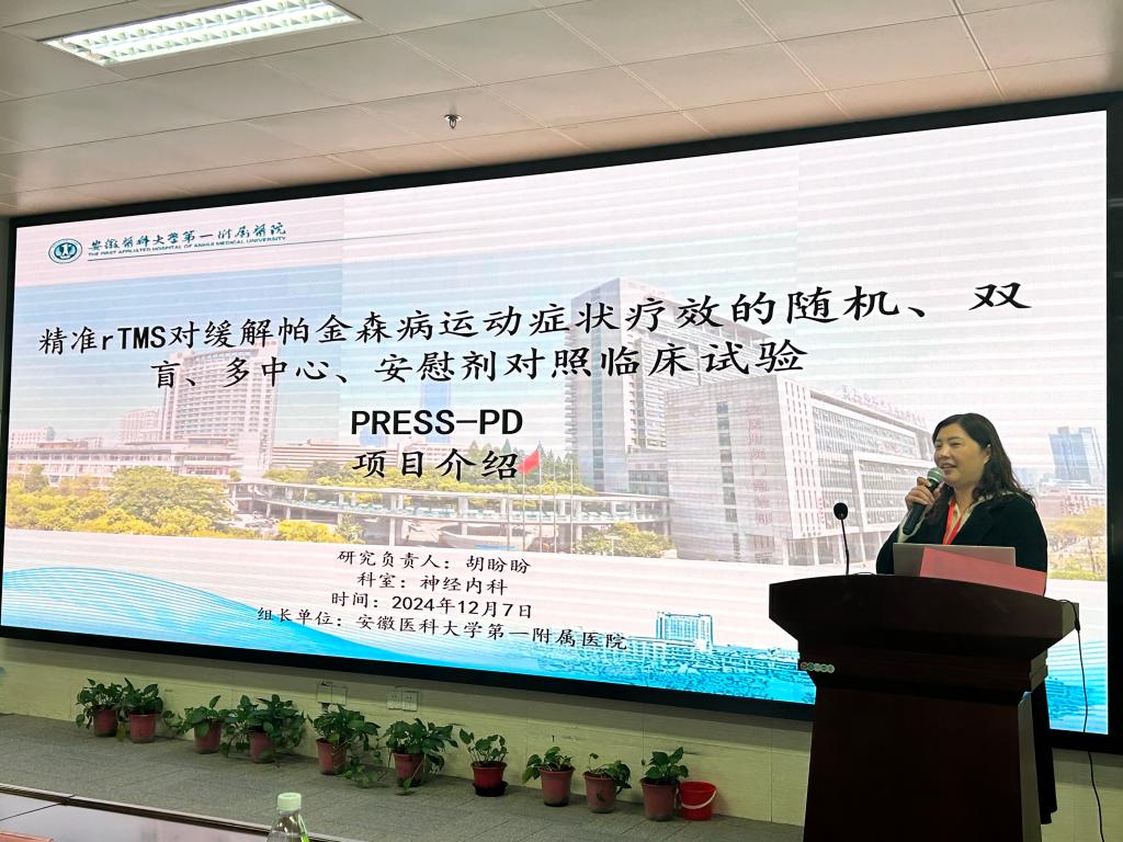 项目首席研究员汪凯代表项目总设计与技术指导致开幕辞。他强调,rTMS是一种安全、无创、有效的神经调控技术,其治疗帕金森病的多项RCT研究结果表明rTMS能够有效改善PD患者的运动功能,包括UPDRSⅢ评分、步态缓慢及言语功能等方面,2020年欧洲rTMS临床治疗指南基于循证医学,将其推荐为帕金森病抑郁和运动症状的B类治疗手段。然而,大多数研究为单中心研究,样本量较小,证据级别低,目前亟须大样本的多中心研究进行疗效验证。他指出,此次PRESS-PD项目为安徽医科大学第一附属医院立项课题,各中心精诚合作共同验证精准rTMS治疗帕金森病运动症状的临床疗效,可以填补国内精准导航定位下治疗帕金森病的多中心研究空白,提供更高级别的循证医学证据,更有助于推动帕金森病有效治疗手段的进一步发展。