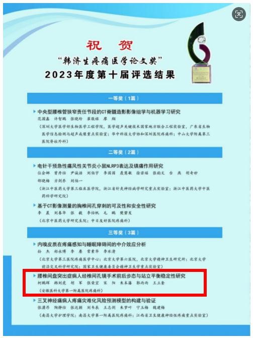 近日,疼痛科柯鹏辉医生在《中国疼痛医学杂志》发表的《腰椎间盘突出症病人经椎间孔镜手术前后步态与站立平衡稳定性研究》文章被《中国疼痛医学杂志》编委会和中华医学会疼痛学分会评选委员会联合评为2023年度“韩济生疼痛医学论文奖”三等奖。