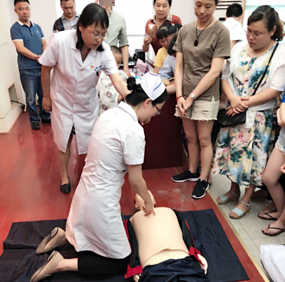 讲座最后环节,张泓教授与EICU护士长在现场利用人体模型给社区医护人员及群众进行心肺复苏的培训。社区居民踊跃参与,通过专家现场指导,社区医护人员操作达到了规范提高。