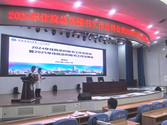 12月31日晚,医院在内科医技楼会议中心召开2024年度住院总科秘书工作总结会暨2025年度住院总科秘书工作交接会。医务处处长汪安勇参加会议并讲话,院2024、2025年度绩溪路院区住院总科秘书共二百余人参加会议。