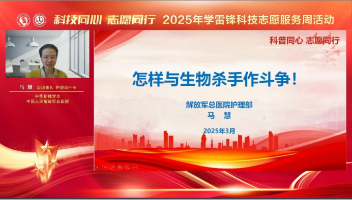 讲座环节以科普讲座、视频展示、在线互动等多形式展开。中华护理学会副理事长马慧在《怎样与生物杀手作斗争》的首场讲座中运用形象生动的比拟,从“生物杀手,你是谁?”,“防御生物杀手的超级战甲”,“打败生物杀手的科技魔法”,“争做和生物杀手斗争的智勇者”4个方面和大家共同探讨如何直面抗争神秘又可怕的生物杀手。