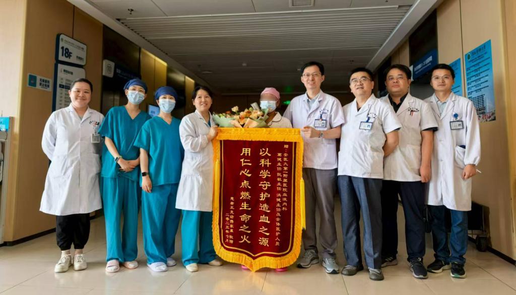 2024年1月,王女士因“咳嗽、发热”就诊当地医院,血常规提示:白细胞计数高达112.92x10^9/L。2024年1月28日急诊收住我科,完善骨髓等检查,明确诊断为急性髓系白血病,经过多次化疗,病情得到了控制。时隔一年,天不遂人愿,2025年02月,王女士病情再次复发,有明确行异基因造血干细胞移植指征。再次化疗达缓解后,经过充分准备,2025年6月4日,王女士进入移植病房进行亲缘半相合异基因造血干细胞移植治疗,移植过程顺利,+14天嵌合度100%,成为我院血液内科第500例移植顺利出仓患者。