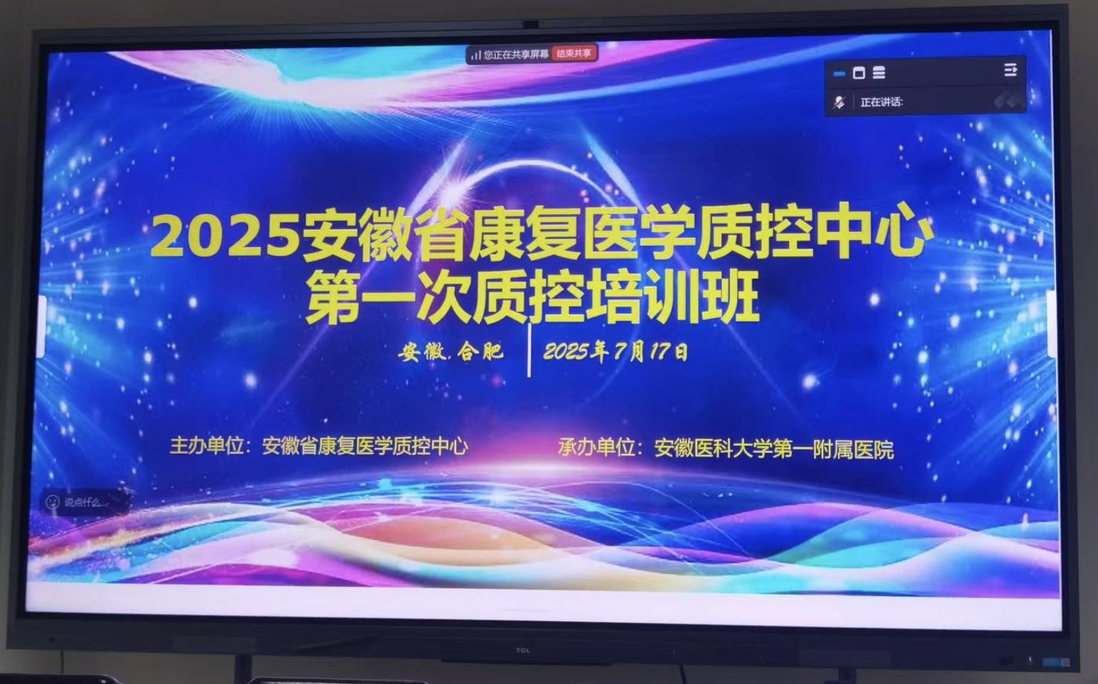 7月17日下午,安徽省康复医学质控中心成功举办2025年度第一次质控培训班。安徽省康复医学质量控制中心主任、副主任、秘书及专家组成员,各地市康复医学质量控制中心主任及秘书,全省各级综合医院及专科医院康复医学科负责人和质控医师等参加培训班。本次培训班以线上直播形式进行。开幕式由安徽康复医学质控中心秘书宋娟主持。