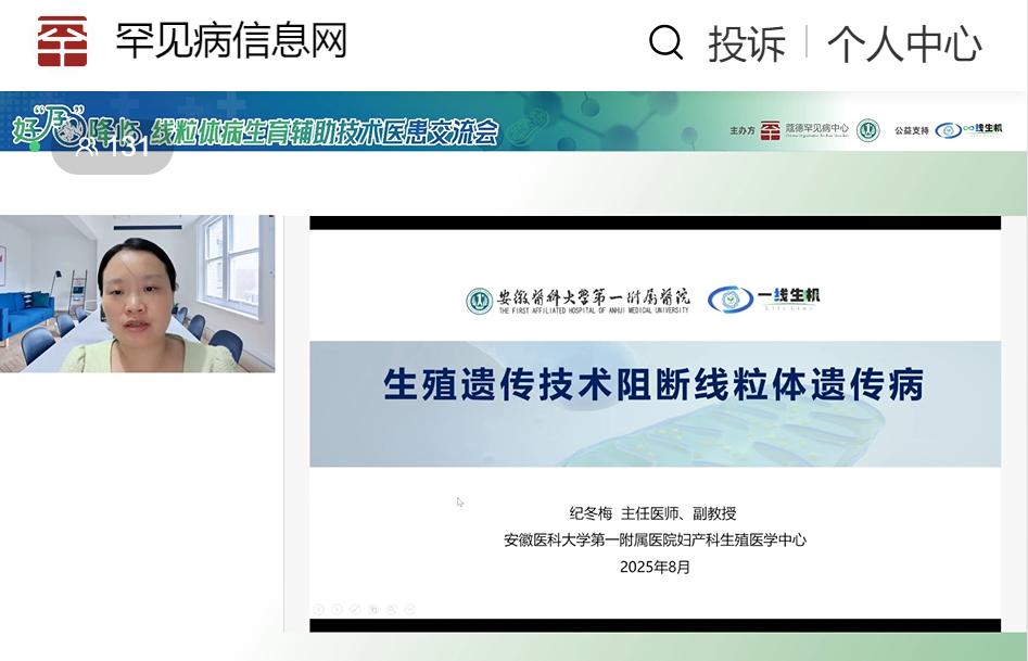 8月27日,妇产科生殖医学中心“一线生机”团队联合国内规模最大的罕见病公益组织“蔻德罕见病中心”,在线上开展了好“孕”降临——线粒体病生育辅助技术医患交流会。妇产科纪冬梅主任医师受邀担任主讲嘉宾,来自全国各地的100余个线粒体疾病家庭参加了此次交流会。