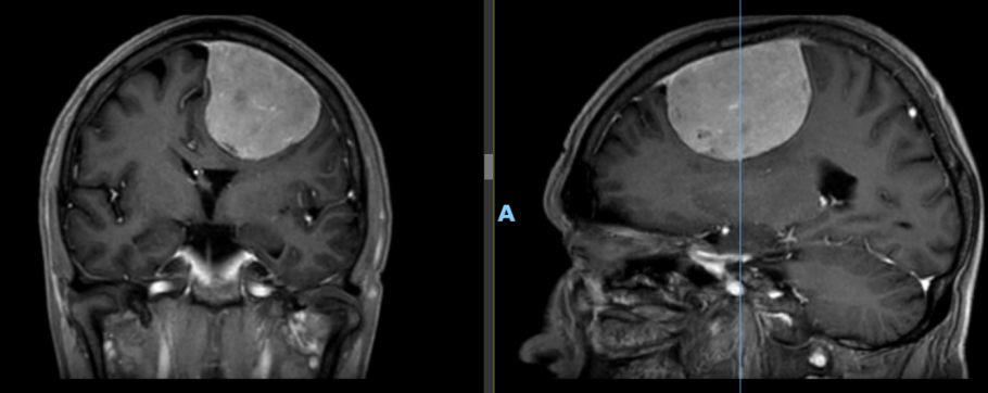 患者李大爷(化名)今年70岁,两个月前开始出现右侧胳膊麻木、活动受限等症状。经家属陪同至我院神经外科就诊,头颅磁共振检查提示其颅内存在一直径约7厘米的矢状窦旁脑膜瘤,体积巨大,病情复杂。
