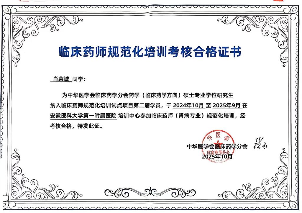 肖荣城同学自2024年10月,进入我院临床药师培训中心接受了为期一年的肾病专业系统培训,指导教师为方玲副教授。培训涵盖了药学查房、用药监护等核心内容,其专业素养与实践能力得到显著提升,最终以优异成绩通过全国统考,为我院此项试点工作积累了有益经验。
