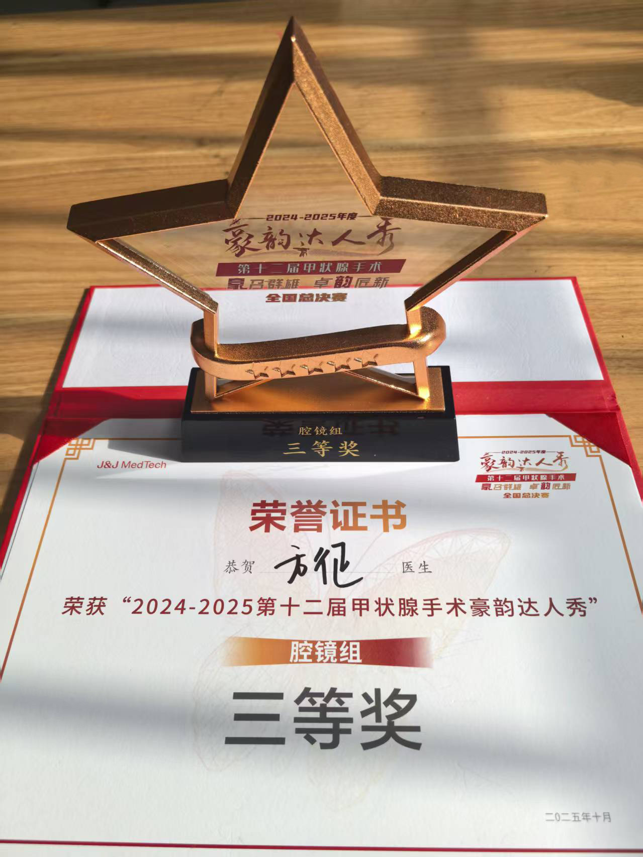 10月24日,第十二届“豪韵达人秀”全国甲状腺手术总决赛在湖北武汉举行。我院甲状腺外科方征副主任医师荣获腔镜组三等奖,刷新了科室在全国赛事上的最好成绩。