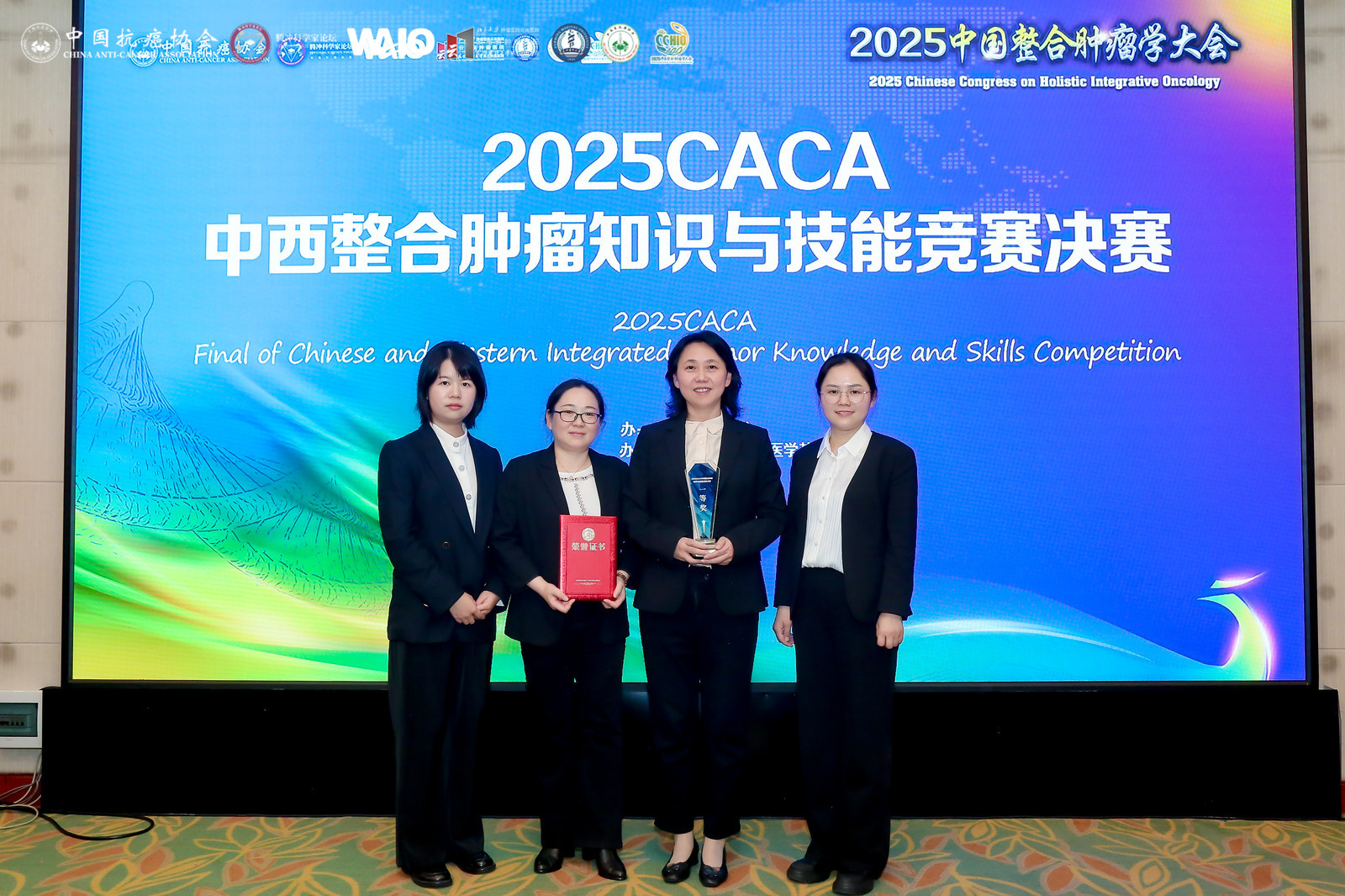 2025中国整合肿瘤学大会(CCHIO)于11月6-9日在昆明召开。期间在全国中西整合肿瘤知识与技能竞赛决赛中,我院中西医结合肿瘤科张梅教授率领苏丽、江海丽、吴悦三位医生组成“徽风杏林”战队,一路攻坚克难,过关斩将,摘得桂冠,以卓越成绩彰显“徽派”中西整合肿瘤诊疗的深厚实力。