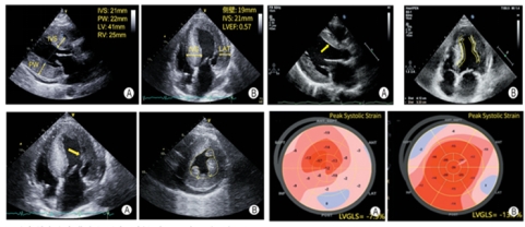 《中国法布雷病超声心动图规范化筛查指南(2024版)》指出法布雷病心脏受累的典型超声心动图表现包括:左心室向心性肥厚、“双边征”、乳头肌不成比例肥大、右心室肥厚并具有正常收缩功能、左心室舒张功能异常、下外侧壁基底段纵向应变减低。