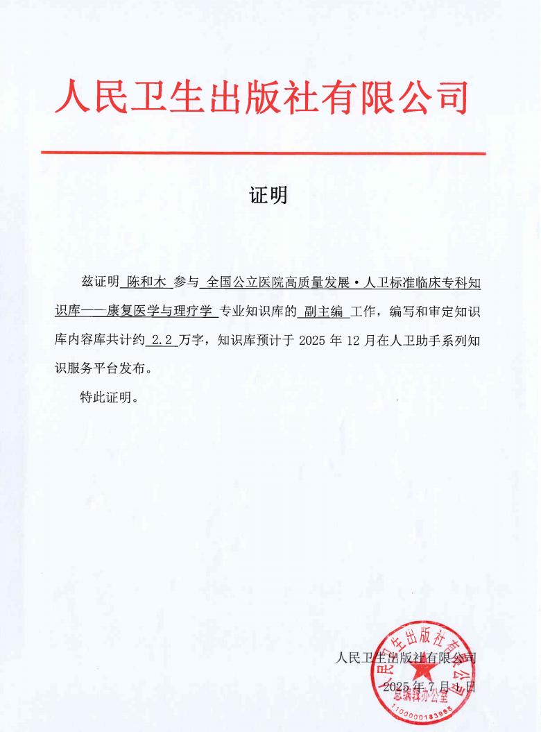 我院康复医学科团队在知识库建设中贡献突出:陈和木教授担任副主编,宋娟、李键副主任医师为编委,王冬、王古月、张伟、陈珣、程迎等临床骨干作为编者,负责“疼痛处理”“压疮管理”“康复医学评定”“内脏疾病康复”等多个关键专题及相关术语的撰写与修订。胡丹丹老师担任编写团队秘书。