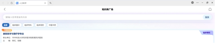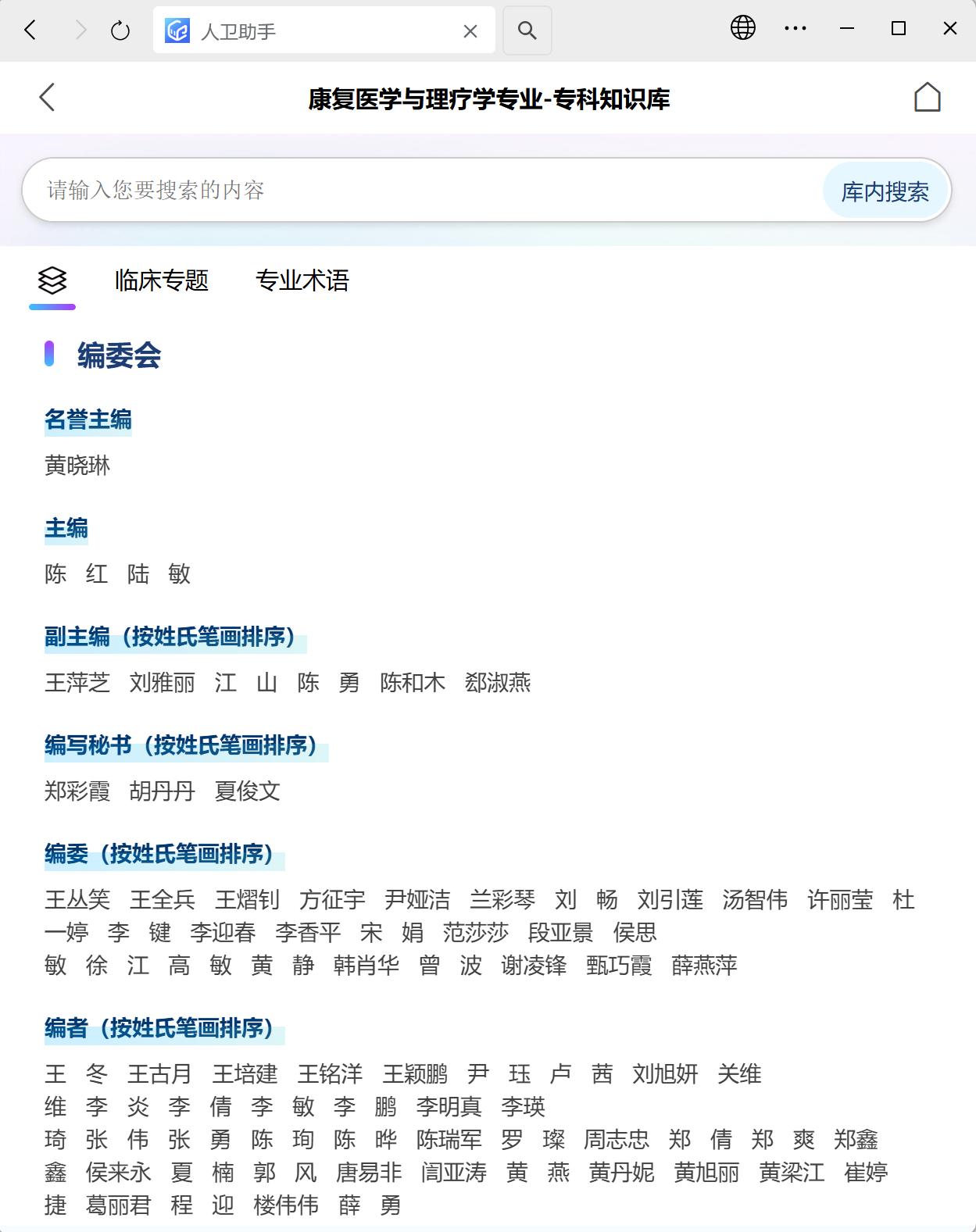 近日,由人民卫生出版社精心打造的临床专科知识库《康复医学与理疗学》(https://kw.pmphai.com/ai/contentSquare?type=lczk)正式权威上线。该知识库由华中科技大学同济医学院附属同济医院陈红教授、陆敏教授领衔主编,标志着我国康复医学领域数字化、标准化知识体系建设迈上新台阶。
