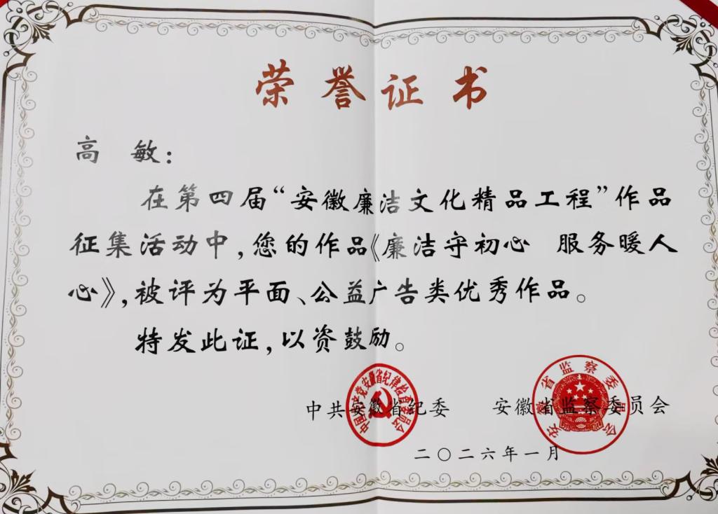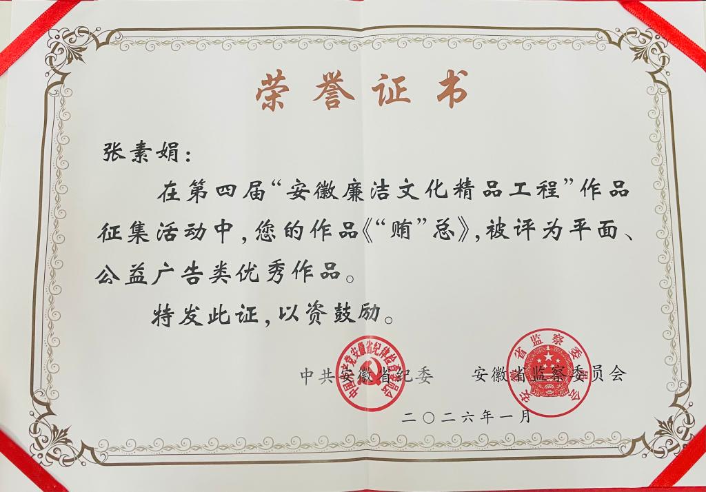 近日,由安徽省纪委监委主办的第四届“安徽廉洁文化精品工程”评选结果正式揭晓。我院皮肤性病科党支部高敏创作的《廉洁守初心 服务暖人心》、普外科西区党支部张素娟创作的《“贿”总》,获评平面、公益广告类优秀作品。