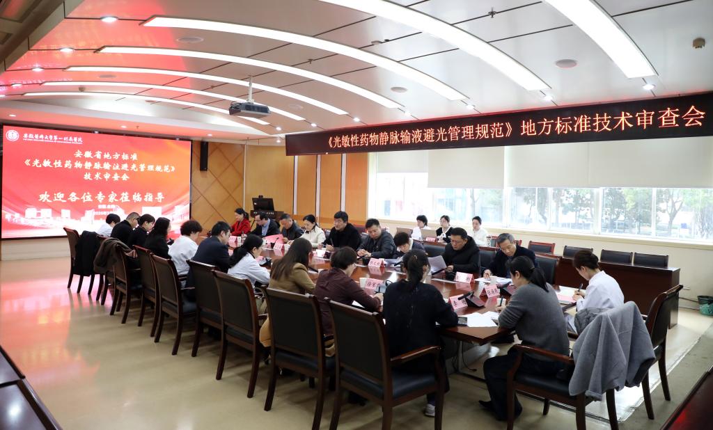 3月6日下午,由我院牵头制订的安徽省地方标准《光敏性药物静脉输注避光管理规范》技术审查会议在医学保健中心二楼会议室召开。安徽省市场监督管理局标准化处四级调研员钱隆、安徽省卫生健康委员会政策法规处三级调研员余鹏亮、安徽省护理学会常务副理事长李志菊,我院护理部部长胡少华、科研处副处长张力参加会议。