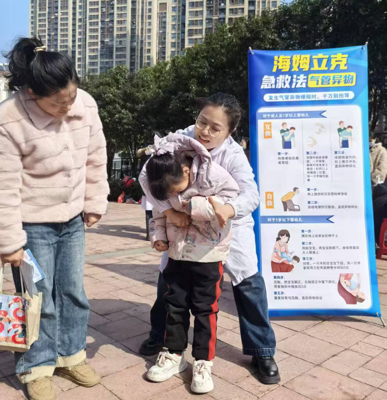 活动现场,医护人员为居民提供免费盆底健康筛查、妇科专家一对一咨询、妇科常见疾病答疑等服务;同时,针对急救技能开展科普与实操,通过海姆立克急救法演示、气道异物梗阻识别与预防知识讲解,提升居民应急处置能力。此外,现场还设置血压测量、血糖检测项目,为居民健康“把脉”。医护人员耐心解答居民疑问,细致讲解健康知识,发放宣传资料,用专业与温暖传递关怀。一位参与义诊的居民表示:“在家门口就能享受专家问诊和免费检查,还能学习急救技巧,这样的活动很贴心!”