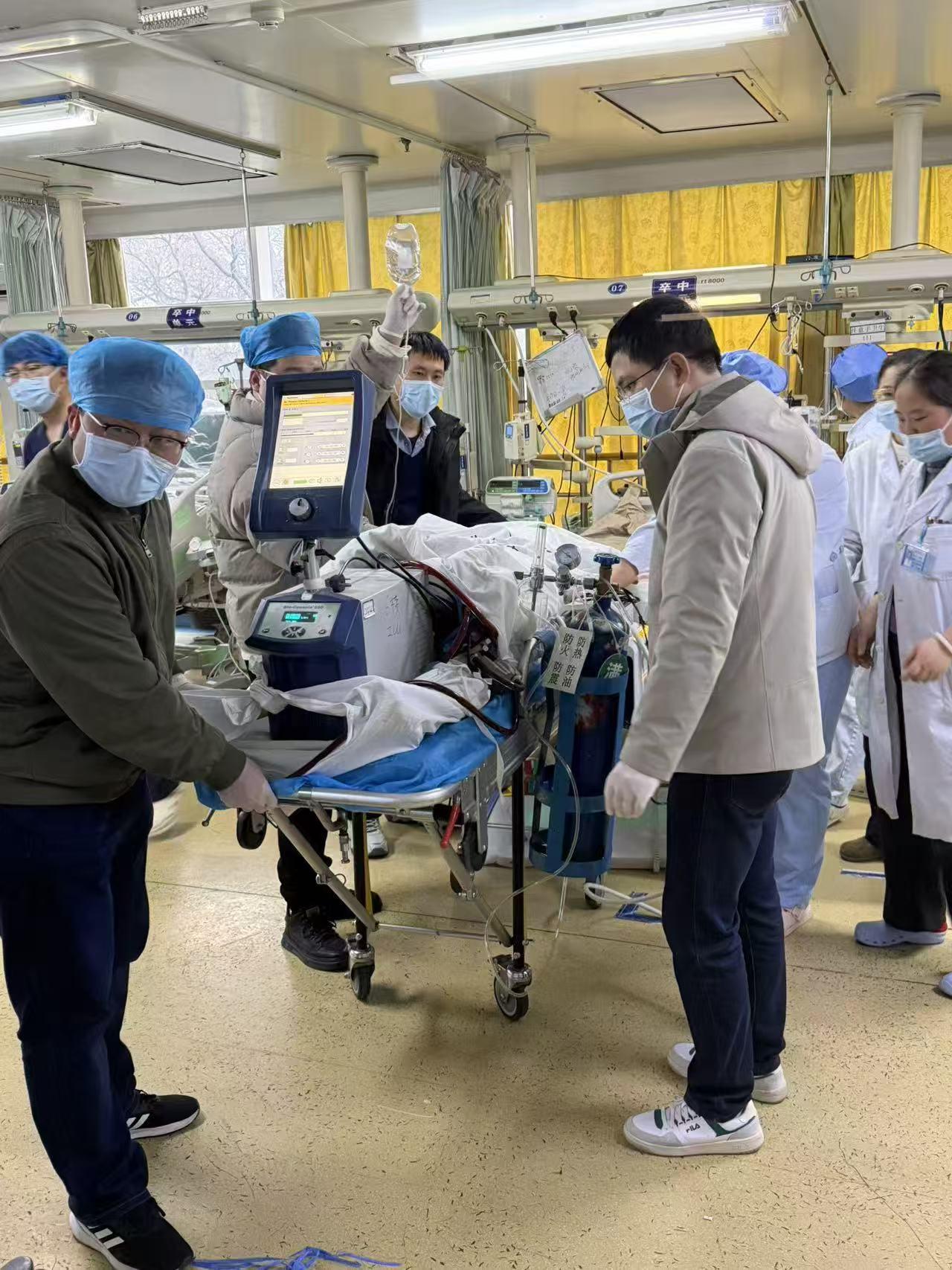 病发当日,周某就餐后突发不适,短时间内发展为心源性休克,意识丧失,生命垂危。当地医院紧急联系我院请求ECMO支援,医院重症医学科团队即刻携带设备于夜间奔赴当地。抵达后,团队迅速开展救治,消毒、穿刺、置管、预冲、上机……整套流程精准有序,ECMO设备顺利运转,成功为患者建立生命支持。