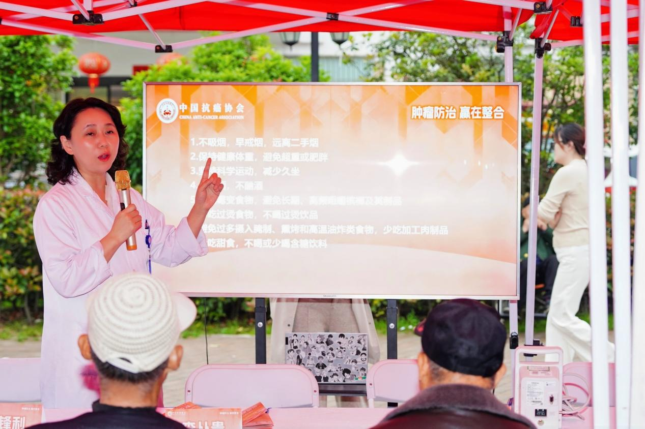本次活动以“早防早筛早治,同心携手抗癌”为理念,组织中西医结合肿瘤医疗、护理专家团队,为居民提供全方位健康服务。现场设置了科普讲座、免费咨询、中医体验三大板块:张梅主任医师解读《中国防癌健康生活方式守则(2026年版)》,传递科学防癌理念;韩江英主任护师、张锋利副主任医师、李从贵护士长、赵雪梅护士长分别围绕时令节气养生、耳穴压丸应用、中药煎服方法、三伏贴防病等主题开展讲解,将实用的中西医结合肿瘤防治与养生知识送到居民身边。