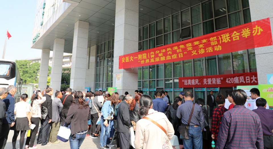 4月20日是世界高尿酸血症日,今年的主题是“远离痛风,关爱肾脏”。为提高大众对高尿酸血症的知晓率,选择合理的饮食及生活方式,当天上午,我院内分泌风湿免疫科党支部和肾脏内科党支部联合在绩溪路门诊广场举办义诊活动。义诊现场,来自我院内分泌科、风湿免疫科、肾脏内科等多个科室的专家团队们为每一位前来咨询的患者耐心诊治,指导大家合理饮食,提供治疗方案并叮嘱患者服药注意事项等。现场还为广大患者提供免费的尿酸和血糖监测,近二百名市民积极参加,现场秩序井然。在检测中发现有多位尿酸值较高的患者,通过此次的义诊活动,让大家普及了疾病知识,达到了防治高尿酸血症的良好效果,受到广大市民的一致好评。