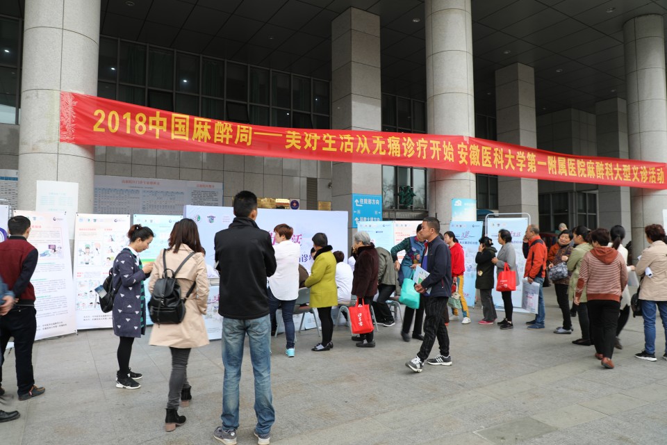 2018年3月30日上午,医院麻醉科在绩溪路门诊前广场举行“2018中国麻醉周——美好生活从无痛诊疗开始”大型义诊活动。上午8时义诊活动正式开始,我院麻醉科刘学胜教授就无痛诊疗方面的知识给广大患者做了一个简短的科普介绍,让大家更好的了解什么是麻醉,麻醉医生所做的工作以及麻醉与大家息息相关的关系。现场前来咨询就诊的患者络绎不绝,专家们认真的聆听患者的病情,根据每位患者的病情给出最好的麻醉治疗方案。义诊现场还为大家分发科普资料,讲解无痛诊疗的优势。短短的一个上午共接诊了几十名患者,有数百位人士前来咨询了解。通过这次义诊活动不仅为一些患者提供服务,更重要的是让大家更好的了解麻醉,认识到麻醉的重要性,从而更好的推动舒适化医疗的开展。