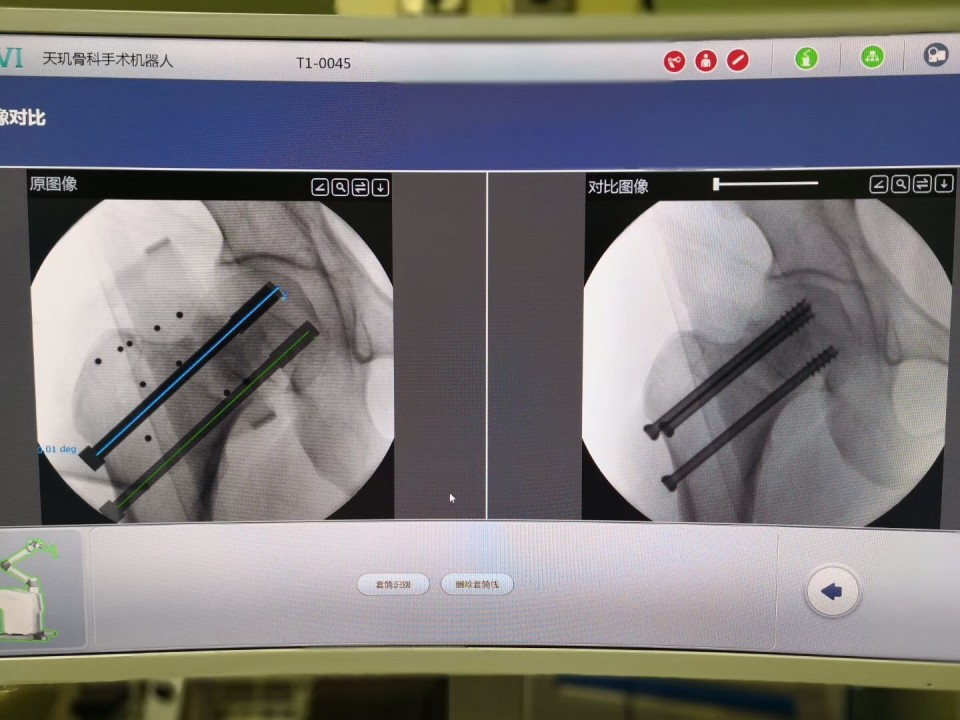 此次“天玑”骨科机器人被应用于两位骨折患者,首台是一位骨盆骨折患者,由于骨盆位置深,解剖关系复杂,传统手术需切开复位后钢板固定,创伤较大,手术时间长,容易出血,术后并发症多,而借助“天玑”机器人,可以闭合复位,并应用最新的闭合通道螺钉技术固定骨折,极大地减少了手术时间与手术创伤;对于另一位股骨颈骨折患者,有着“透视眼”、“稳定手”之称的“天玑”再次不负众望,利用计算机进行精确的置钉规划,使得螺钉分布更合理,固定更确切,更有利于骨折的愈合,从而减少股骨头坏死的发生率。