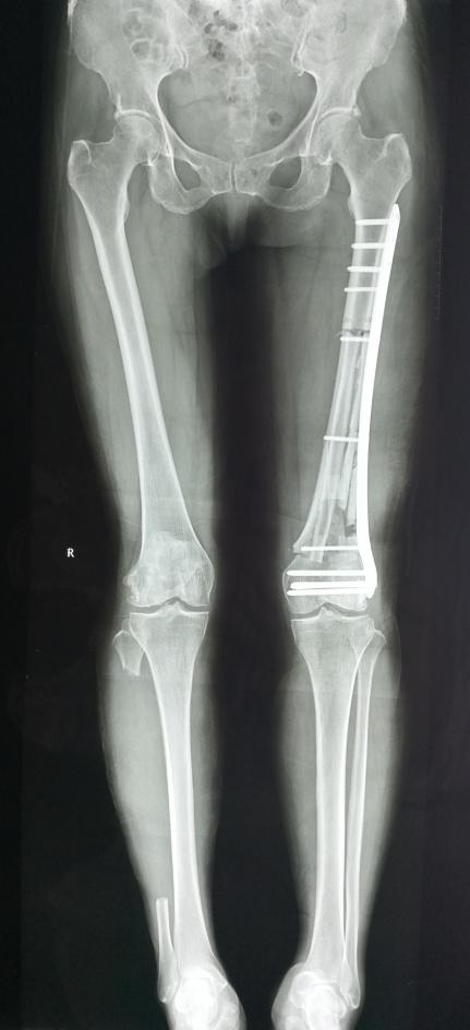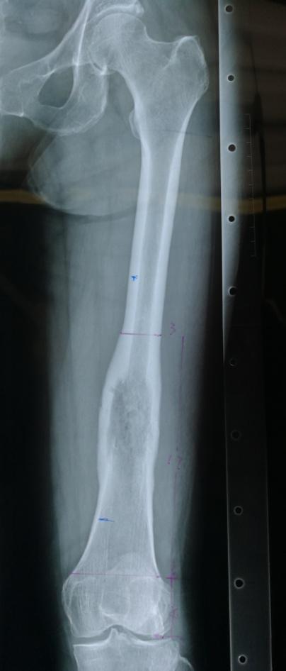 骨病骨肿瘤科近日成功实施“带血管腓骨复合大段异体骨移植手术”。患者冯女士,因左侧大腿疼痛3个月,经检查提示左股骨恶性肿瘤。患者慕名就诊我院骨病骨肿瘤科,科主任胡勇教授团队经反复讨论并细致规划,最后决定为其实施左股骨恶性肿瘤广泛切除,行生物重建手术(即带血管腓骨复合大段异体骨重建股骨),手术过程顺利,患者术后恢复良好康复出院。