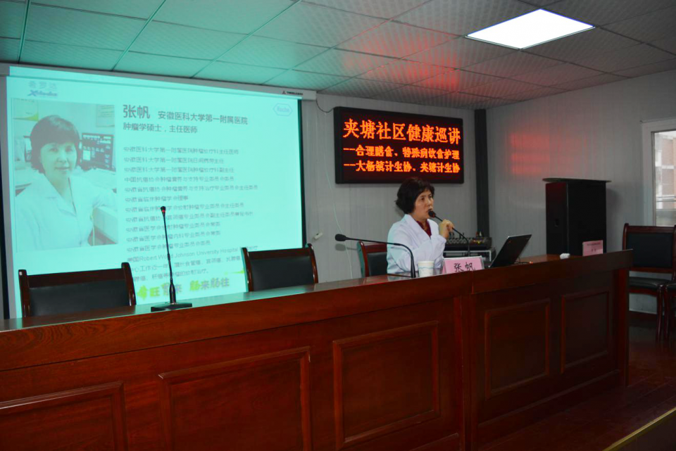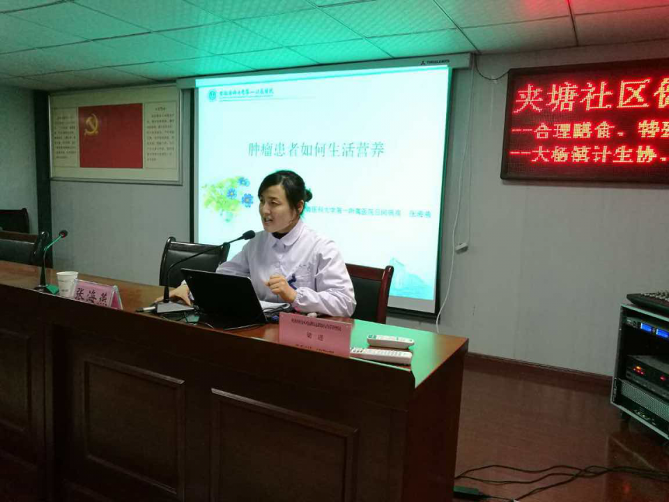 1月18日下午,日间病房在肿瘤放疗党支部的支持下,走进社区,在夹塘社居委四楼活动中心开展了健康教育讲座。此次公益性讲座,以《关注营养、传递健康》为主题,围绕居民们最关心的日常话题,普及健康营养知识,开展肿瘤健康营养的一级预防。