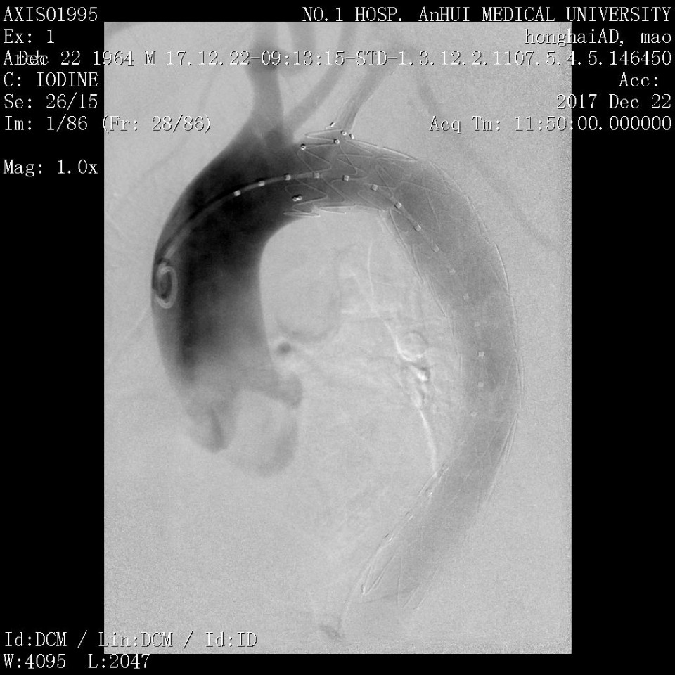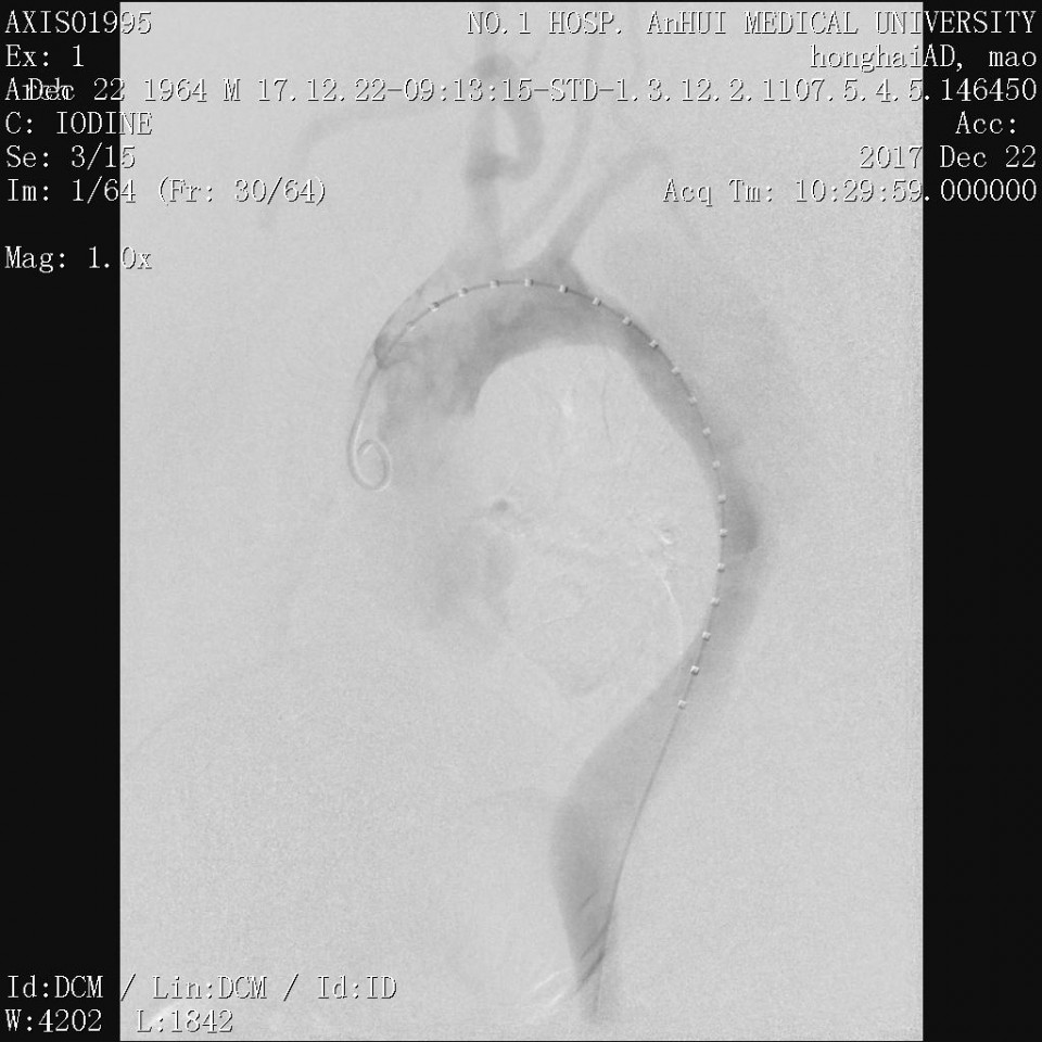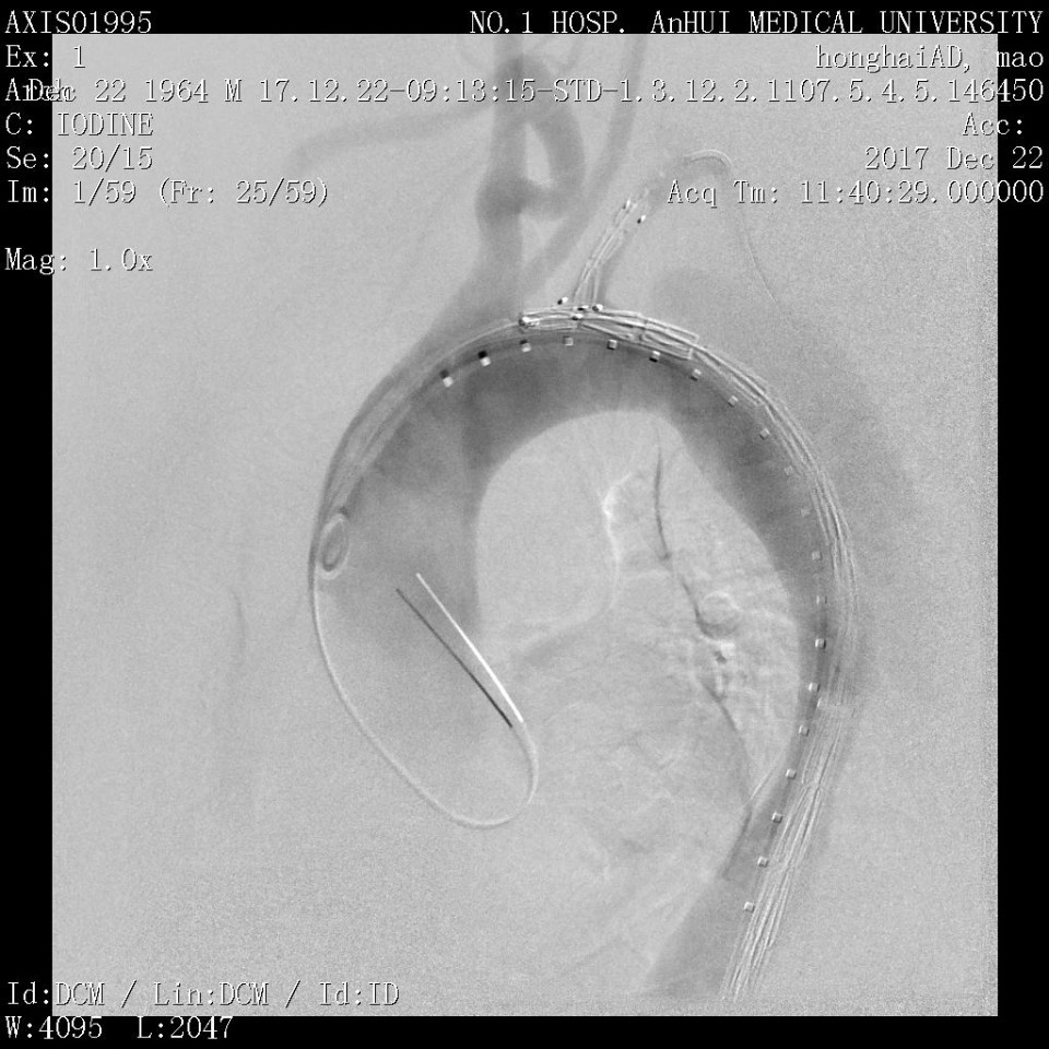 近日,我院血管外科成功应用Castor分支型支架(图1)治疗胸主动脉夹层一例,该病例为我省的首例植入。患者男性,53岁,因“突发胸痛2天”入院,既往有高血压病史。经CTA检查诊断为胸主动脉夹层,破口距离左锁骨下动脉(LSA)36mm,假腔逆撕至左锁LSA(图2、3)。既往一般选用直管型支架,需要部分或全部封闭LSA,但可能增加脑梗和截瘫风险。考虑到患者年龄较轻又是体力劳动者,经科室讨论决定使用Castor一体式分支型覆膜支架,一方面通过增加健康锚定区 (LCCA-LSA距离+LSA直径),进一步降低支架对于血管壁的刺激,从而降低夹层逆撕的风险;另一方面重建LSA保留功能,且不影响LCCA血流。 整个手术过程顺利,最后造影:Castor分支型支架定位精准,无移位;支架近端三重小波段密封性能良好,无内漏,破口被完全封堵,真腔被打开;LSA及LCCA血流通畅,手术圆满成功。病人术后恢复良好(图4、5、6)。
