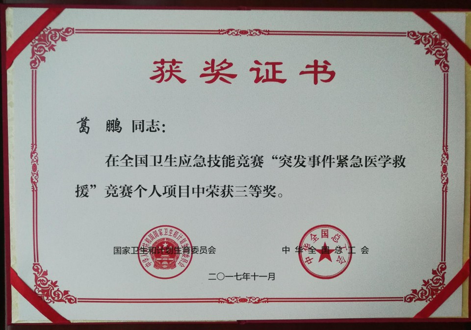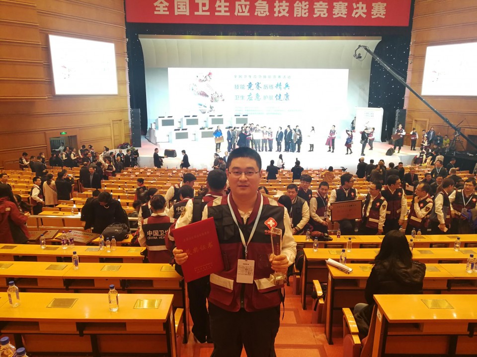 11月15至16日,全国卫生应急技能竞赛在北京会议中心举行。我院脊柱外科葛鹏主治医师被安徽省卫生计生委选拔进入安徽省代表队,并在“突发事件紧急医学救援”竞赛个人项目中荣获三等奖,为省内医院首次获此类比赛最高奖项。本届竞赛以“技能竞赛历练精兵,卫生应急护航健康”为主题,共有来自各省和新疆生产兵团选派32支优秀代表队参赛。比赛分为复赛和决赛,其中复赛包括紧急医学理论答题、桌面推演及技能操作,决赛包括必答题、看图查错题、快问快答题、抢答题和风险题。