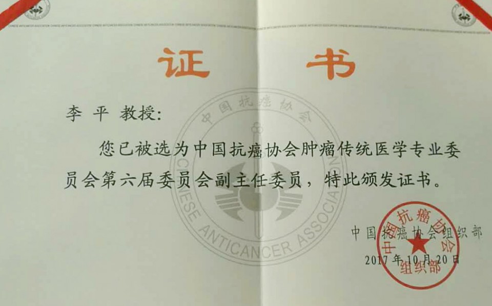 由中国抗癌协会肿瘤传统医学专业委员会主办的“中国抗癌协会第六届肿瘤传统医学专业委员会”于2017年10月20日至22日在天津顺利召开。大会邀请国内外知名专家、教授进行学术交流,是中医肿瘤界高层次的学术交流盛会。在中国抗癌协会肿瘤传统医学专业委员会组织部的主持下,大会选举了中国抗癌协会“肿瘤传统医学专业委员会”第六届主委,副主委,常务委员及青年委员。与会委员一致推荐我院中西医结合肿瘤科李平教授担任中国抗癌协会肿瘤传统医学专业委员会第六届委员会副主任委员。此外,李平教授就“中医肿瘤学内涵浅谈”的主题进行了报告,阐述了“毒生病络理论”在肿瘤治疗的应用,进一步提升了我院中西医结合肿瘤科在国内外的知名度和影响力。