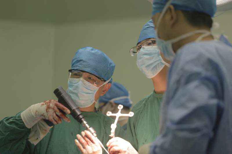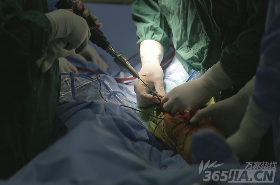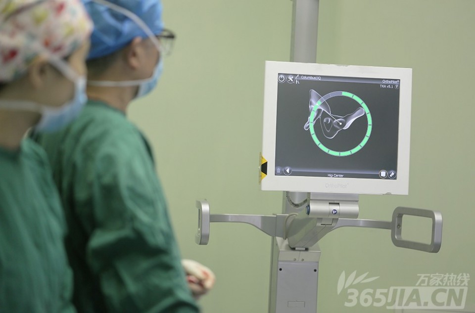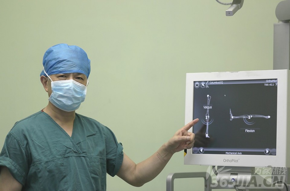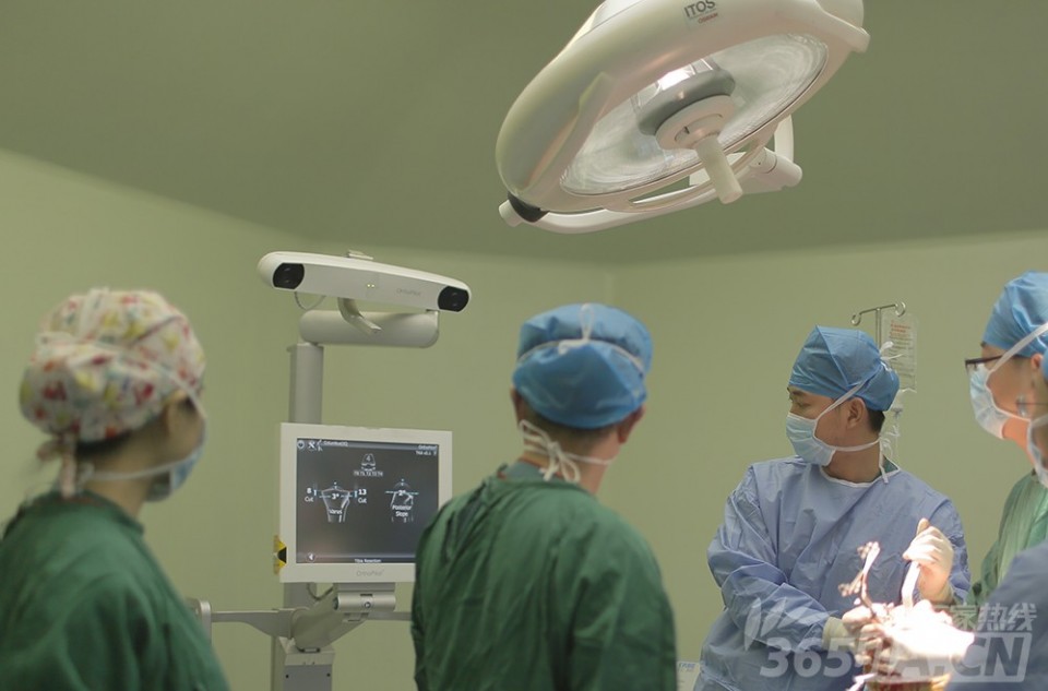图为医生根据计算机导航辅助调整角度。尹宗生主任透露,“常规的膝关节置换手术通过髓腔内定位,然而,计算机导航辅助下人工膝关节置换术解决了这一难题,术中进行截骨处理的时候,不需要进行髓内定位,还减少了术后出血、脂肪栓塞的风险”。