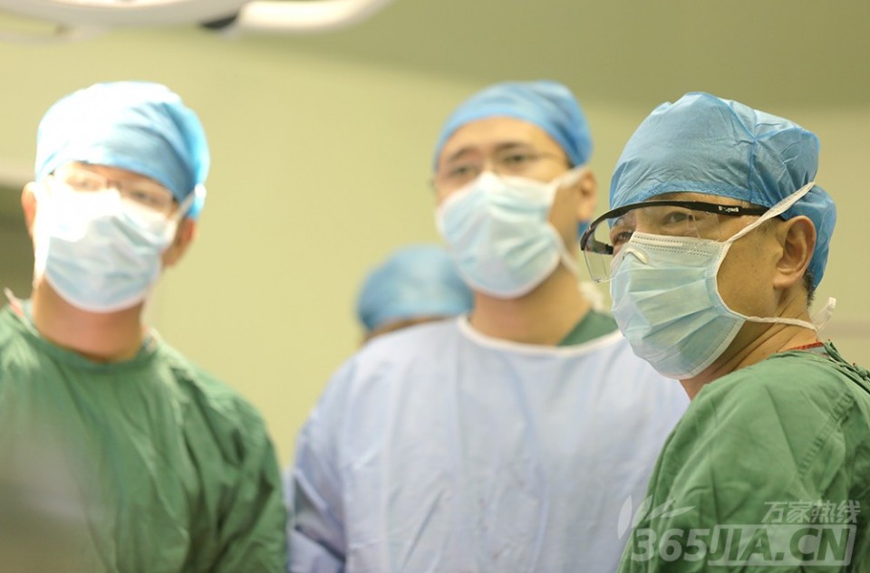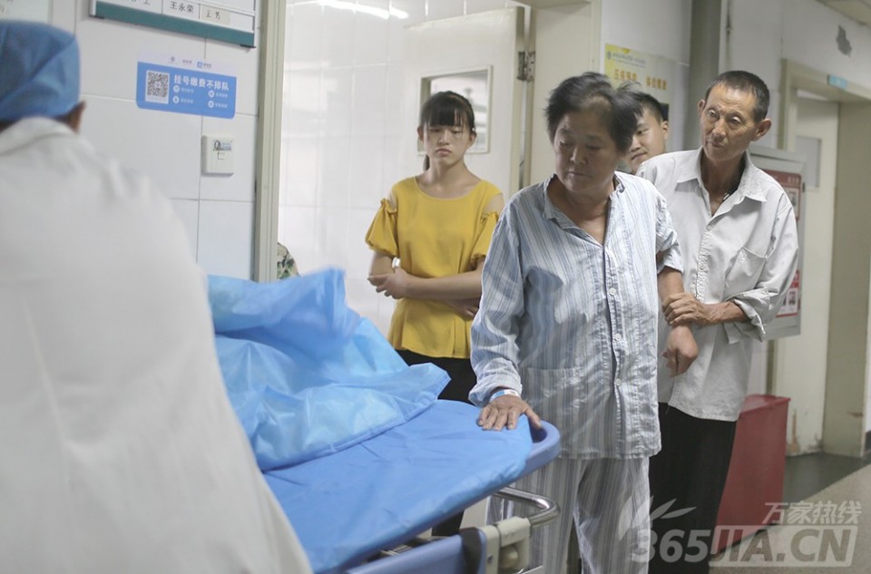 老伴扶着唐大妈躺上病床去手术室。手术当天,唐大妈的老伴、儿媳、两个孙子也都赶到医院陪伴,“她从来没有做过手术,也没有打过麻药,这次要全麻,怕她害怕,一家人都来陪着给她打气”,唐大妈老伴说。