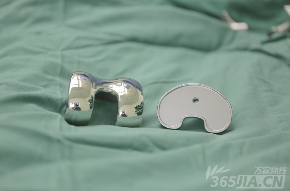 图为即将植入唐大妈体内的人工膝关节,人工关节不同的部件由不同的材料制成,并且通过适当的方法将人工关节假体固定在骨组织上,假体的关节表面要进行抛光处理。目前,钴、钛、钢铁基合金金属材料组成人工膝关节的股骨髁胫骨平台的表面,超高分子聚乙烯材料组成人工膝关节垫片部分,聚甲基丙烯酸甲酯骨水泥用于人工关节假体与骨组织的固定。骨水泥是一种用于骨科手术的医用材料,由白色粉末和无色带刺激气味的液体两部分制剂组成,使用时,只要按一定比例,将它们倒在一起调和,即可在室温下发生聚合反应。开始像砂浆,进而如同稀粥,接着变成面团一样,可以揉捏、挤压成任意形状,最后逐步固化,整个过程只有十几分钟。尹宗生主任在其硬化前,将它置于准备更换关节的部位,随即安上人工关节。