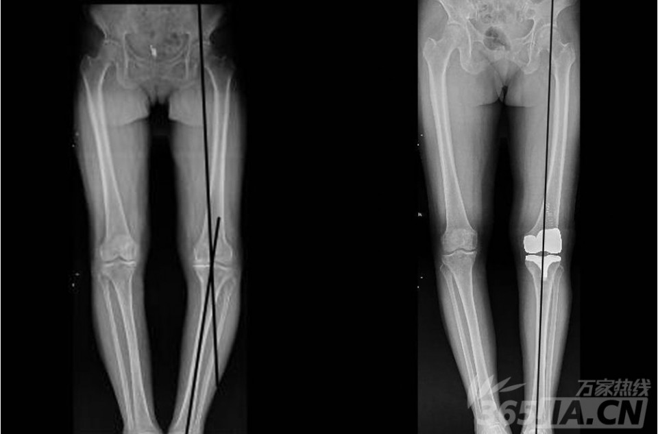 图为唐大妈计算机导航辅助下人工膝关节置换术前后对比图,术前患者力线有15°,术后为0°,基本恢复正常。(左图为手术前,右图为手术后)。据悉,该项手术从去年10月份开展以来,病人术后恢复均良好。尤为值得一提的是,膝关节置换术已纳入医保按病种收费,新农合病人在省内医院报销可达到70%。原本需要5万的手术费,报销后只需自费1.5万。