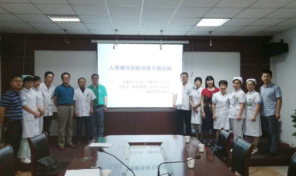 7月20日下午,经党委书记梁朝朝积极联系,由我院器官移植中心赵红川主任、泌尿外科一病区金宗兰护士长、重症医学科许伦兵副主任医师、器官捐献管理办公室朱乃庚主任、申振副主任和孙胜红主管护师组成的OPO团队来到宿州市立医院开展器官捐献与移植宣传工作。该院高度重视此次宣传工作,陈军副院长出席宣讲会并作重要讲话,宿州市立医院重症医学科、神经内外科、急诊内外科等相关科室医护人员参加了宣讲会。我院器官移植中心赵红川主任和重症医学科许伦兵副主任医师分别作了题为《人体器官捐献移植实践》、《浅谈脑死亡判定》的知识讲座,随后与会人员针对人体器官捐献与移植的具体实践问题进行了互动讨论。