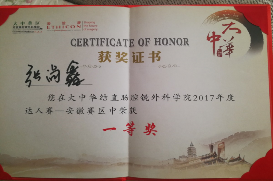 本次赛事由大中华结直肠腔镜外科学院主办,分初赛(30%)、决赛(70%)两次不同手术视频比赛,得出总成绩,并仅一名选手可晋级全国总决赛。在比赛中,张尚鑫医师最终凭借着扎实的腹腔镜技术,精细的手术操作,彻底的肠系膜上动脉暴露、淋巴结清扫以及完美的手术团队配合,其“腹腔镜辅助下右半结肠癌根治术(D3)”在众多参赛选手中脱颖而出,获得在场评委的好评,获得安徽赛区第一名,并晋级全国总决赛。