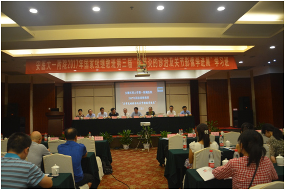 2017年7月28-7月30日,由我院风湿免疫科主办的“关节炎的诊治及关节影像学进展”国家级继教班在合肥召开,副院长费广鹤出席会议并致欢迎词,会议由我院风湿免疫科主任徐建华和徐胜前教授主持。台北荣民总医院内科部过敏风湿免疫科主任周昌德教授,中国医师协会副会长、中国人民解放军301医院风湿免疫科主任黄烽教授和邓小虎教授,广州中山三院风湿免疫科古洁若教授,上海长征医院风湿免疫科徐沪济教授和吴歆教授,上海长海医院风湿免疫科赵东宝教授,上海仁济医院风湿免疫科吕良敬教授和郭强教授,西京医院风湿免疫科吴振彪教授,郑州大学第一附属医院风湿免疫科高冠民教授等国内著名风湿病专家应邀到会并进行精彩的专题讲座,会议还邀请了我院骨科尹宗生教授和放射科钱银峰教授以及省内著名风湿病专家到会并带来了精彩的专题讲座。我院风湿免疫科已连续3年承办以“关节炎”为主题的国家级继教班,为扩大我院在该领域的影响力进行着不懈的努力。