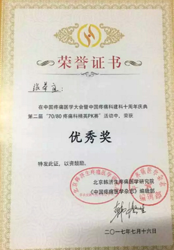 我科赵家贵博士和张荣宜博士作为安徽省代表应邀参加了大会举办的“70/80疼痛科精英演讲比赛”。演讲中张荣宜博士详细展示了我科室全体医护人员为科室发展的积极探索,引起与会专家、同仁的一致共鸣,在与全国各省、市代表的激烈竞争中脱颖而出,以“70组”预赛第一名的成绩进入决赛,并最终荣获综合赛全国第四名的优异成绩,展示了我科室在全国的影响,为我科乃至全省疼痛界赢得了荣誉!