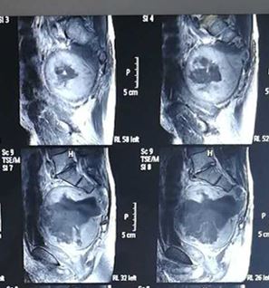 日前,我院关节与骨肿瘤外科与介入科、麻醉科、输血科、手术室等相关兄弟科室共同协作,顺利完成了一例全省较为罕见且手术难度极大的巨大骶骨肿瘤切除术。患者男性,52岁,因“大便变细1年余”入院,就诊于我院关节与骨肿瘤外科。据骶尾椎MRI检查显示,骶椎占位伴组织突入盆腔,考虑为脊索瘤可能,需要手术治疗。 但是,针对巨大的骶骨肿瘤,手术困难重重。首先,肿瘤瘤位于骶椎并突入盆腔,手术解剖难度大,且瘤体血供丰富,术中最关键的就是避免大出血;其次,要降低神经受压迫的症状,以保证患者术后正常行走及正常大小便功能;再次,肿瘤与骨盆及邻近脏器关系紧密,切除过程中需特别注意肿瘤对膀胱、直肠、腹部大血管等的压迫或侵犯。此外,腰骶部为躯体生物力学中枢,术后需要重建,且重建难度很大;最后,肿块巨大,切除后皮肤的缝合和愈合问题,术后的监护和治疗问题等,都是关系着预后的要点。