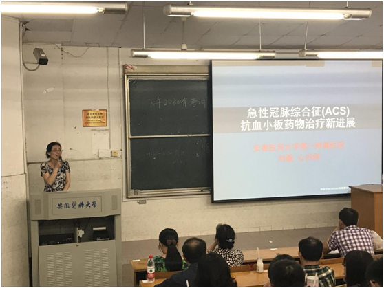 6月12日晚6点30分,药剂科在安徽医科大学12102教室举办了2017年6月份业务学习。全科120余名药师参加此次学习。本次业务学习,科室有幸邀请到心内科刘敏主任。刘主任给大家做了《急性冠脉综合症抗血小板药物治疗新进展》为主题的讲座。讲座的一开始刘主任给在座药师普及了血管痉挛和微血管栓塞是急性冠脉综合症的病理机制,随后介绍了早期抗血小板药物噻氯吡啶的在临床上副作用。最后给大家介绍了新型抗血小板药物替格瑞洛最新临床应用进展。整场讲座刘主任结合自己丰富的临床经验和科研结果,精彩生动,重点突出,参加学习人员获益颇多。