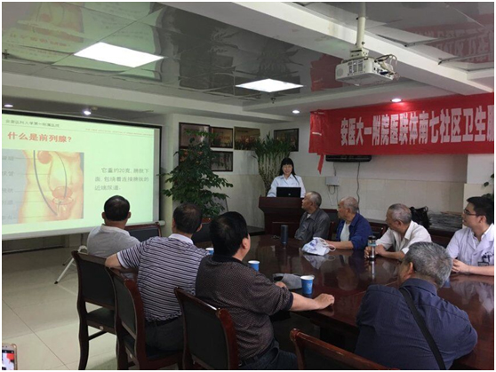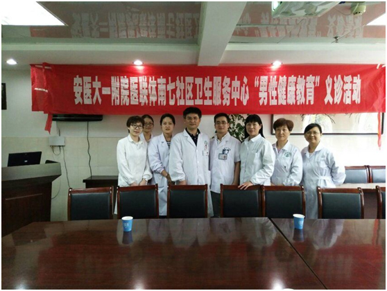 为响应国家对医联体建设的号召,进一步落实分级诊疗和护理制度,带动基层医疗机构发展,提高基层医疗机构的服务水平和服务能力,为居民提供高效、便利的诊疗护理服务,我院与合肥多家社区卫生服务机构签订医联体服务。2017年5月18日由泌尿外科金宗兰护士长带队,由医生王伟博士、护士杨巧兰、刘玲、李磊5人组成的医疗护理小组到我院医联体合作单位蜀山区南七街道社区服务中心进行题为“男性健康教育”义诊活动。社区夏赤院长指派吴金和刘晓娣2位主任负责组织社区老年男性30余人参会,义诊活动由吴金主任负责接待和安排。
