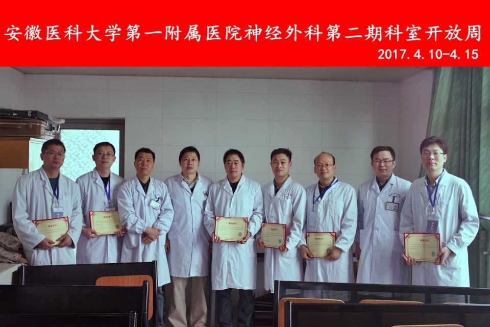 4月10日至4月15日,神经外科成功举办了安徽医科大学第一附属医院神经外科第二期科室开放周,开放周主要内容包括手术演示,临床教学查房,疑难病例讨论以及专业学术系列讲座:程宏伟主任医师(我院神经外科科室情况简介);汪宇扬(重症神经创伤患者的营养支持治疗);肖瑾副主任医师(鞍区肿瘤的内镜治疗);赵亮主治医师(脑血管解剖概论);罗靖副主任医师(神经介入新技术进展);王先祥副主任医师(椎间盘疾病微创手术介绍)。