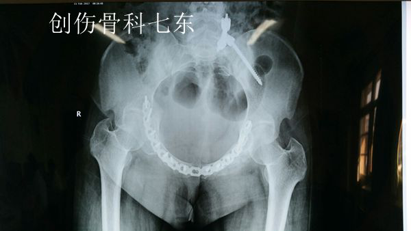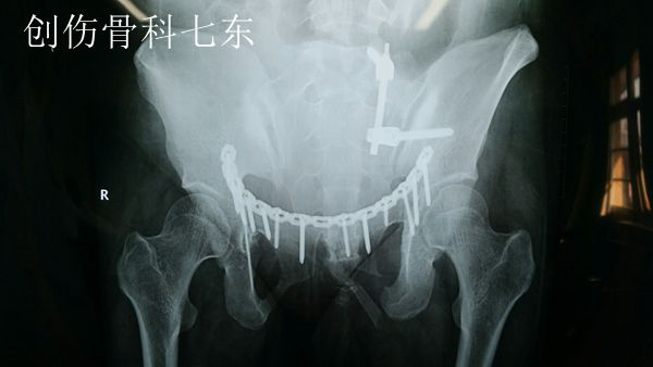 骨盆出口位可见骨折得到满意复位,内植物位置满意,固定稳固