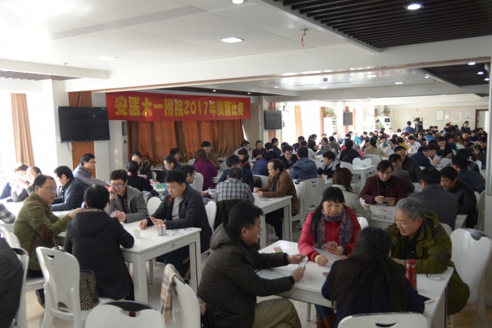 1月13日下午,医院2017年迎新春“掼蛋”比赛在职工餐厅举行。来自35个分工会140余名职工参加了比赛。现场气氛热烈,叫好声不断。经过4个小时紧张激烈的比赛,角逐出一等奖4个,二等奖5个,三等奖18个。院党委副书记戴晓支、工会负责人为获奖选手颁奖。