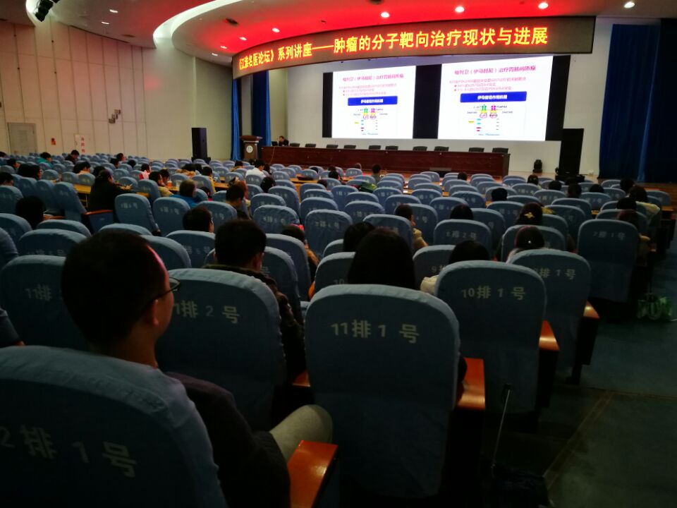 2016年12月21日晚,由我院毕业后教育处主办的“江淮名医论坛”——《肿瘤的分子靶向治疗现状与进展》在内科医技楼4楼会议中心举办,此次讲座由我院肿瘤科专家顾康生教授主讲,医院规培的住院医师及部分我院医护人员等约150余人参加了本次讲座。恶性肿瘤始终是严重威胁人类生命的疾病之一,传统治疗方法主要是以手术、放疗和化疗为主,而针对肿瘤的特异性分子靶点设计的抗肿瘤治疗具有高效低毒的优点。顾康生教授在讲课中深入浅出的为大家介绍了分子靶向治疗的现状和靶向药的分类方法。分子靶向治疗在多种肿瘤的治疗中均显示出较高的疗效,很多靶向药物已在临床上取得了良好的治疗作用,突出表现在治疗肺癌、乳腺癌和结直肠癌这些高发肿瘤领域。顾教授也在授课中讲解了当前靶向药物存在的问题及今后的研究方向。